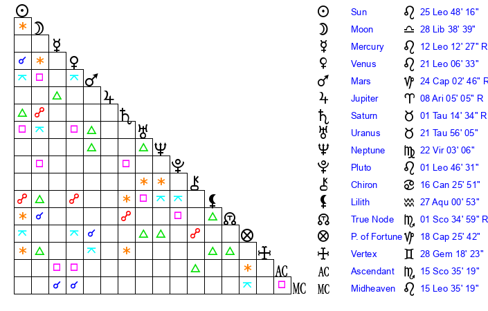 | Mercury | 12 Leo 12 | 8 Leo 24 | 12 Sagittarius 25 |