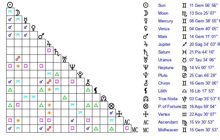 | Sun | 11 Gemini 56 | 12 Gemini 24 | 7 Virgo 7 |