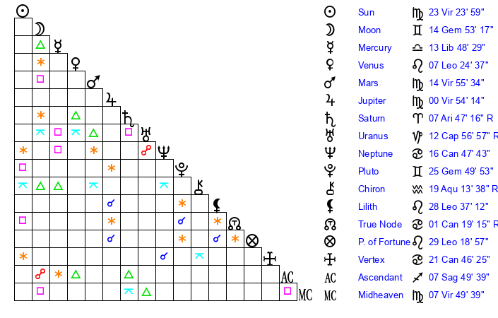 | Moon | 14 Gemini 59 | 22 Cancer 59 | 17 Virgo 31 |