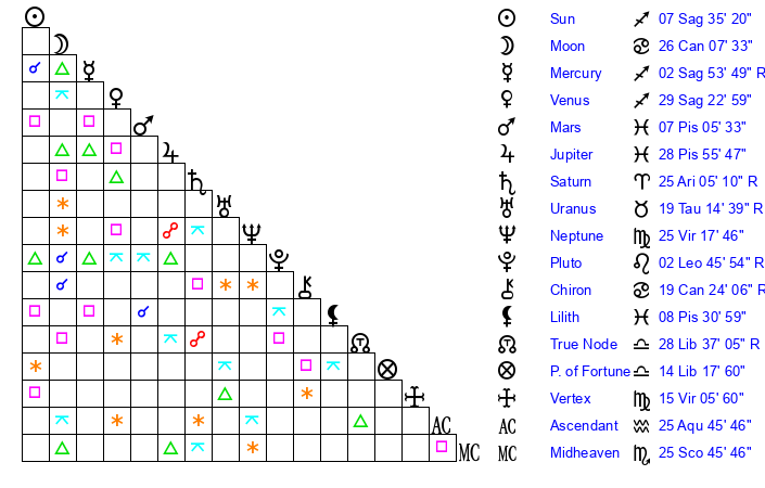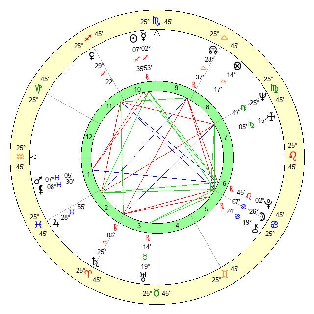 | Moon | 25 Cancer 57 | 9 Aries 25 | 23 Virgo 15 |