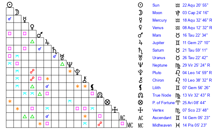 | Sun | 22 Aquarius 21 | 23 Aquarius 13 | 14 Taurus 33 |