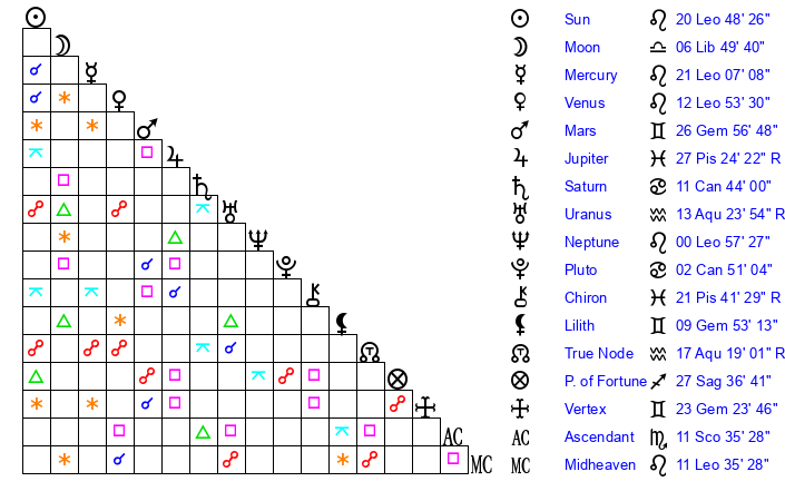 | Sun | 20 Leo 48 | 22 Leo 9 | 9 Sagittarius 26 |