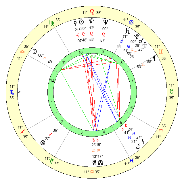 | Moon | 6 Libra 52 | 2 Taurus 2 | 13 Libra 38 |