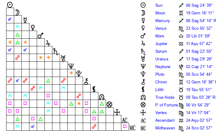 | Venus | 23 Scorpio 56 | 27 Scorpio 19 | 14 Capricorn 15 |
