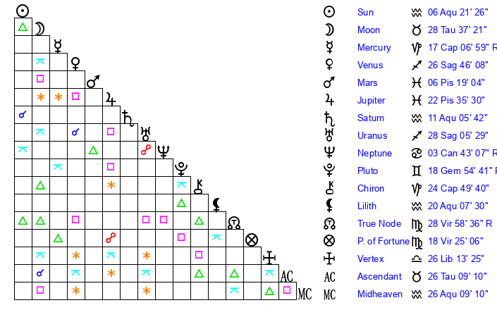 | Sun | 6 Aquarius 21 | 8 Aquarius 1 | 5 Gemini 56 |