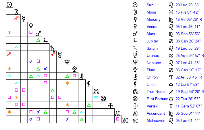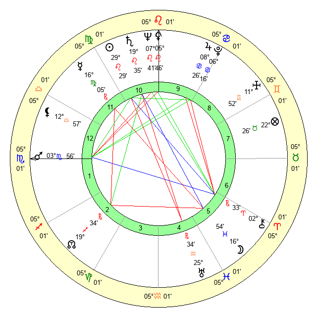 | Sun | 29 Leo 29 | 0 Virgo 34 | 15 Sagittarius 33 |