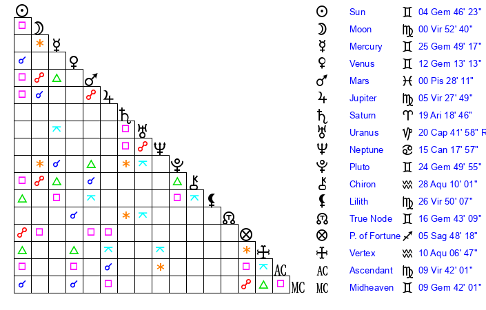 | Sun | 4 Gemini 47 | 5 Gemini 42 | 26 Virgo 6 |