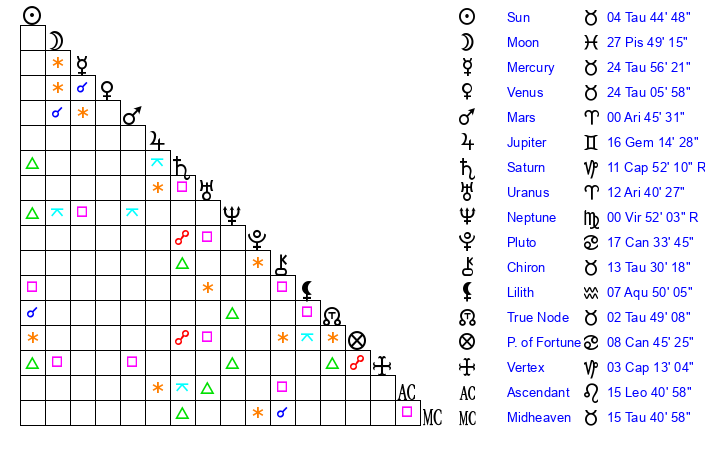 | Venus | 24 Taurus 7 | 27 Pisces 32 | 17 Virgo 15 |