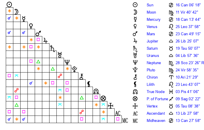 | Moon | 11 Virgo 38 | 21 Sagittarius 46 | 17 Virgo 29 |
