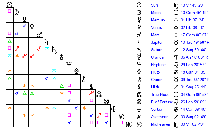 | Sun | 13 Virgo 50 | 14 Virgo 21 | 20 Sagittarius 27 |