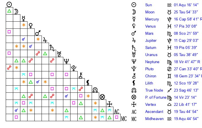 | Mercury | 16 Capricorn 58 | 19 Capricorn 49 | 19 Taurus 4 |