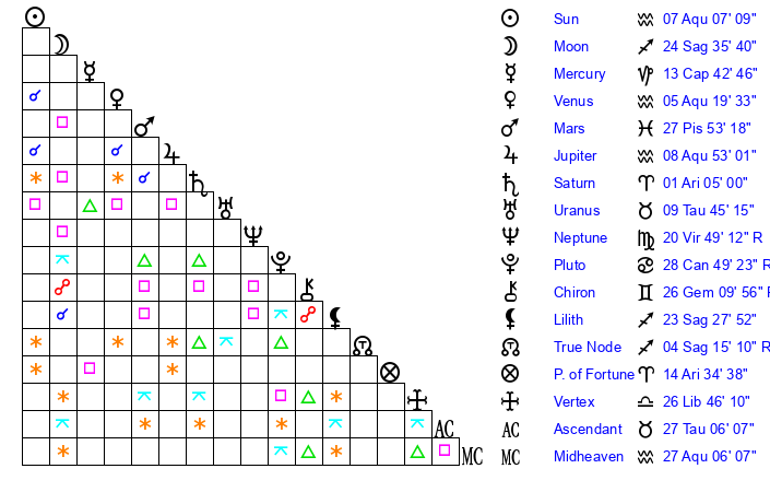 | Sun | 7 Aquarius 7 | 8 Aquarius 1 | 3 Taurus 51 |