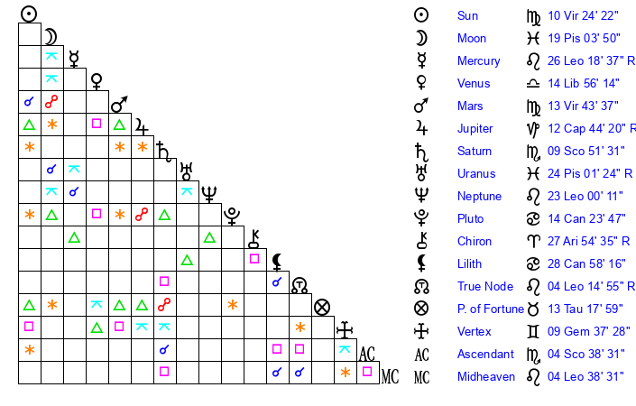 | Mercury | 26 Leo 19 | 1 Virgo 44 | 18 Sagittarius 3 |