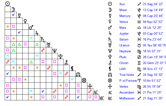 | Mercury | 8 Capricorn 21 | 4 Sagittarius 52 | 14 Pisces 2 |