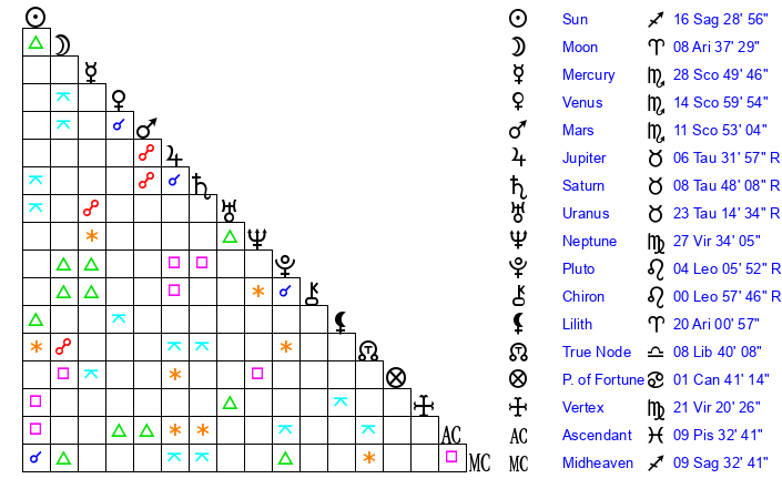| Sun | 16 Sagittarius 29 | 16 Sagittarius 51 | 12 Pisces 44 |