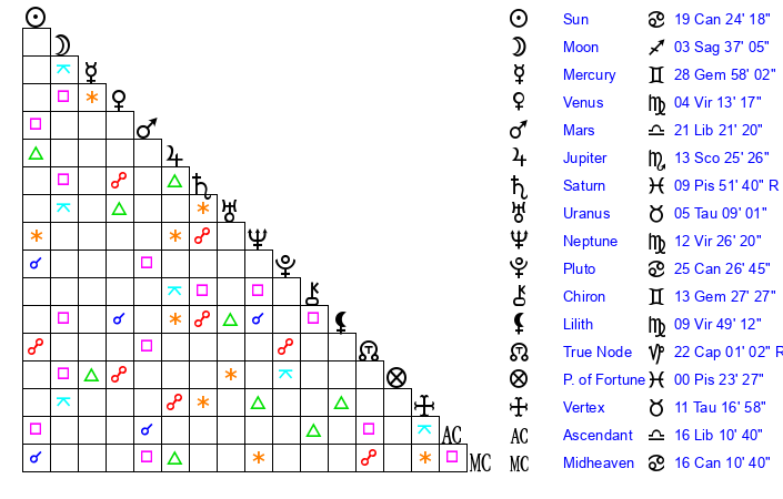| Mars | 21 Libra 20 | 14 Virgo 38 | 16 Sagittarius 49 |