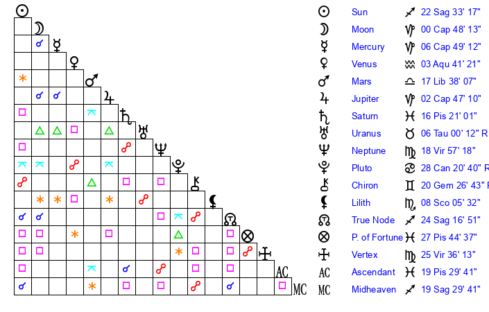 | Sun | 22 Sagittarius 33 | 22 Sagittarius 57 | 22 Pisces 42 |