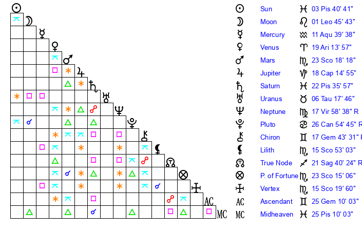 | Sun | 3 Pisces 40 | 4 Pisces 19 | 0 Gemini 12 |
