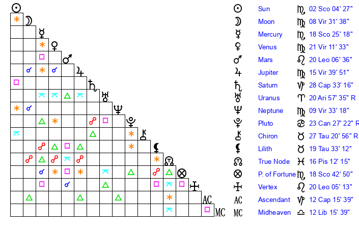 | Moon | 8 Virgo 32 | 18 Sagittarius 11 | 15 Aquarius 55 |