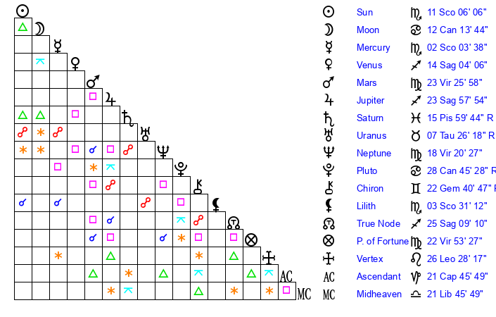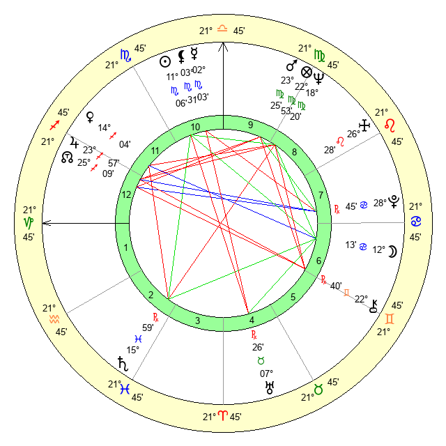 | Mars | 23 Virgo 26 | 29 Scorpio 24 | 13 Scorpio 21 |