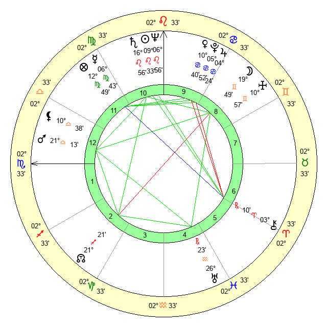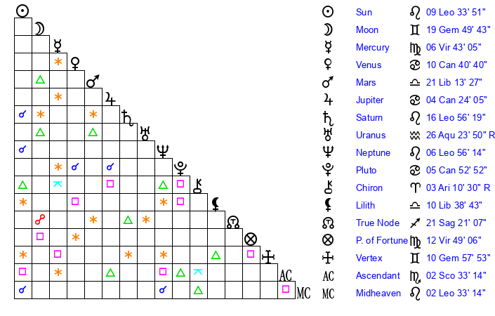 | Neptune | 6 Leo 56 | 1 Aries 57 | 9 Leo 19 |