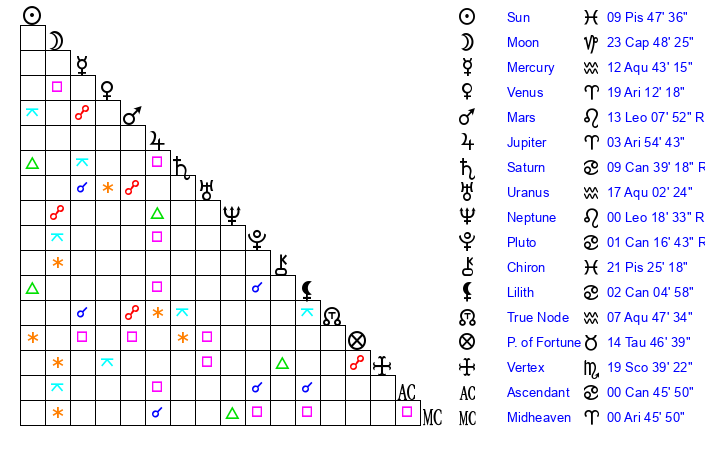 | Sun | 9 Pisces 47 | 11 Pisces 22 | 26 Gemini 7 |
