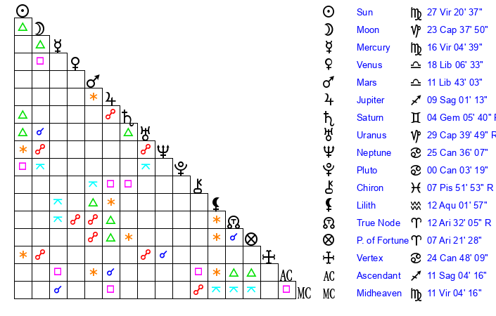 Moon | 23 Capricorn 46 | 14 Virgo 58 | 7 Pisces 33 |