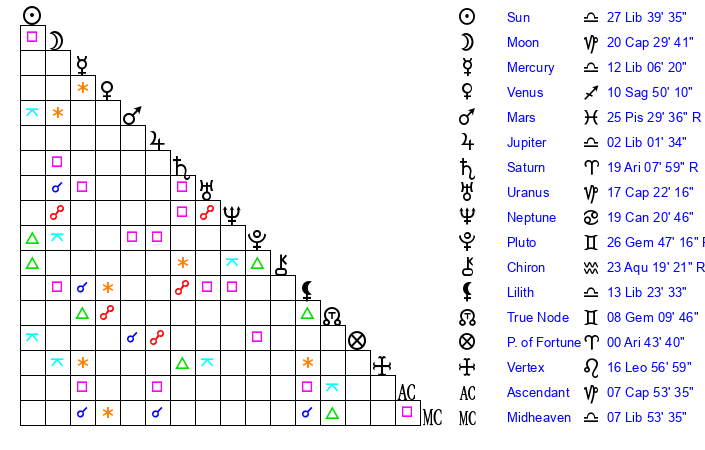 | Sun | 27 Libra 40 | 28 Libra 33 | 25 Aquarius 9 |
