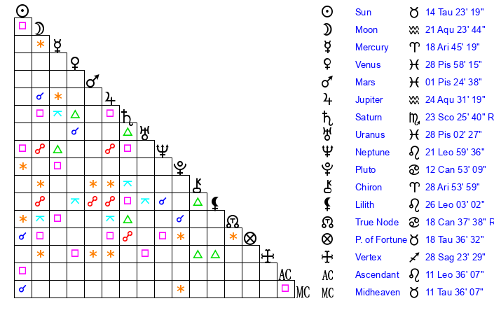 | Neptune | 21 Leo 59 | 1 Aries 14 | 24 Leo 19 |