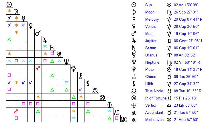 | Sun | 2 Aquarius 59 | 3 Aquarius 57 | 7 Taurus 40 |