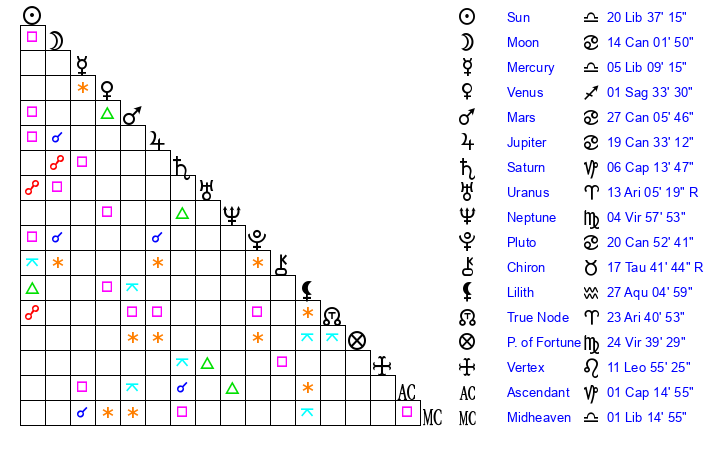 | Sun | 20 Libra 37 | 21 Libra 36 | 26 Capricorn 38 |