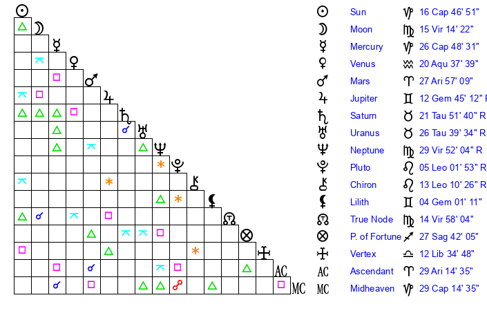 | Moon | 15 Virgo 14 | 27 Aries 1 | 29 Virgo 40 |