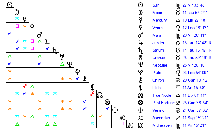 | Moon | 11 Taurus 57 | 14 Virgo 58 | 21 Gemini 20 |