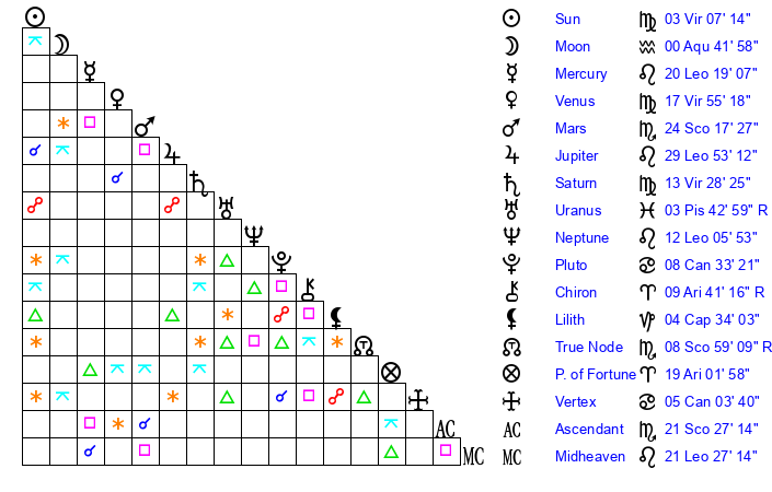 | Venus | 17 Virgo 55 | 1 Leo 13 | 26 Capricorn 39 |