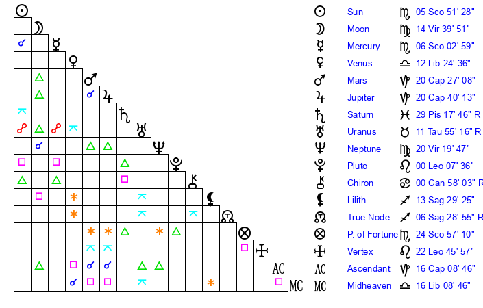 | Sun | 5 Scorpio 51 | 6 Scorpio 31 | 5 Aquarius 5 |