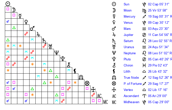 | Mercury | 19 Sagittarius 0 | 11 Sagittarius 26 | 16 Aries 18 |
