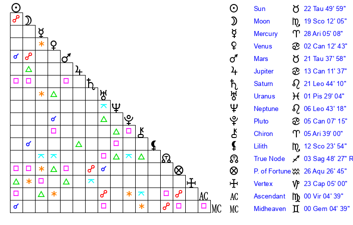 | Moon | 19 Scorpio 12 | 16 Sagittarius 18 | 10 Libra 38 |