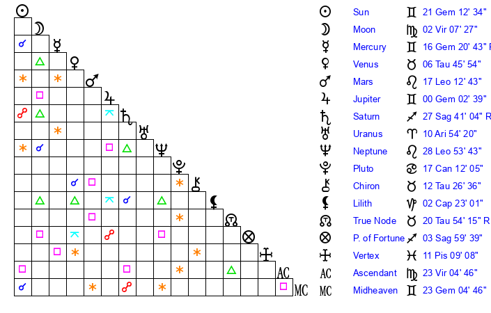 | Sun | 21 Gemini 13 | 21 Gemini 58 | 23 Virgo 19 |