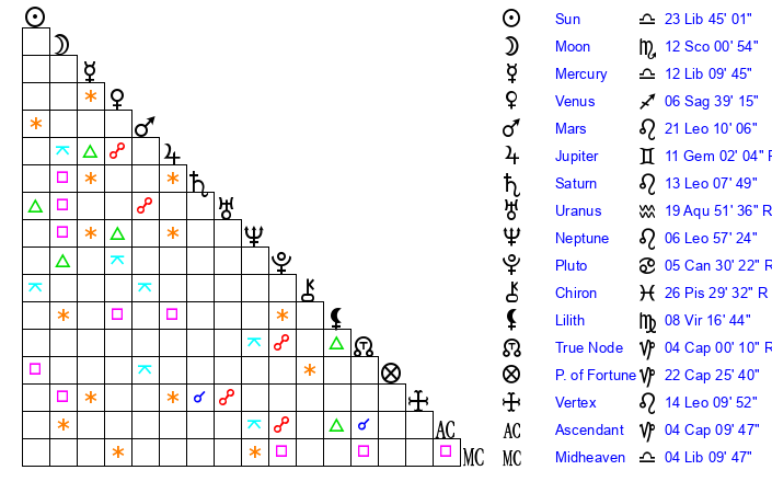 | Sun | 23 Libra 45 | 24 Libra 34 | 13 Aquarius 3 |