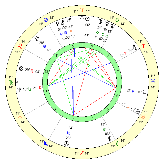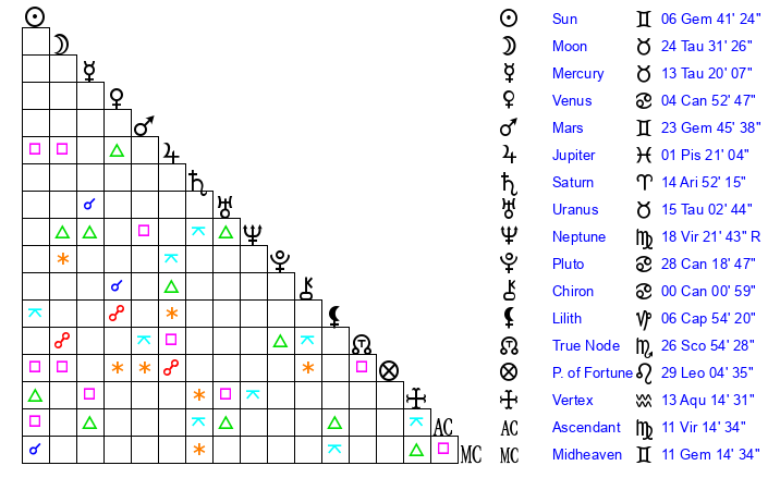| Sun | 6 Gemini 41 | 7 Gemini 37 | 29 Leo 53 |