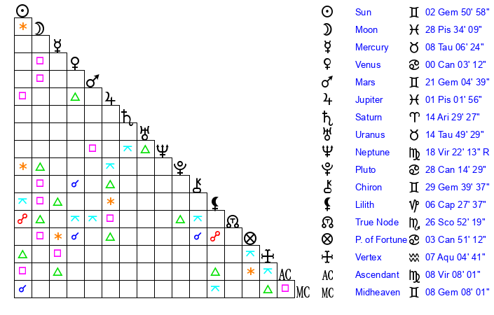 | Jupiter | 0 Pisces 58 | 26 Gemini 23 | 27 Aquarius 22 |