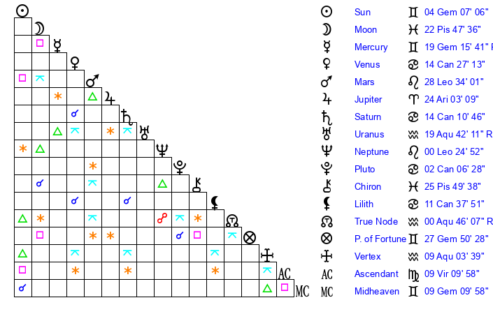 | Sun | 4 Gemini 7 | 4 Gemini 44 | 18 Virgo 36 |