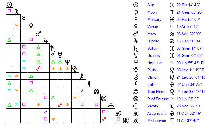 | Sun | 22 Pisces 15 | 23 Pisces 22 | 12 Gemini 14 |