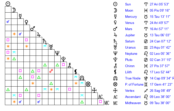 | Sun | 27 Aries 6 | 27 Aries 56 | 10 Leo 45 |