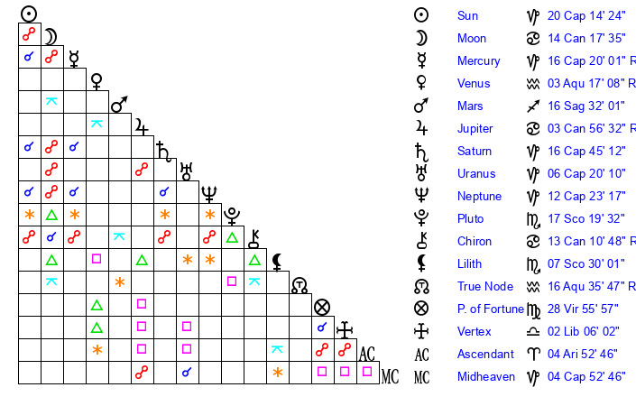 Moon | 14 Cancer 19 | 10 Gemini 2 | 22 Libra 39 |