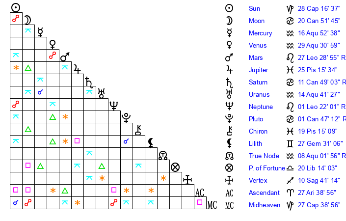 | Neptune | 1 Leo 22 | 27 Pisces 38 | 0 Leo 5 |
