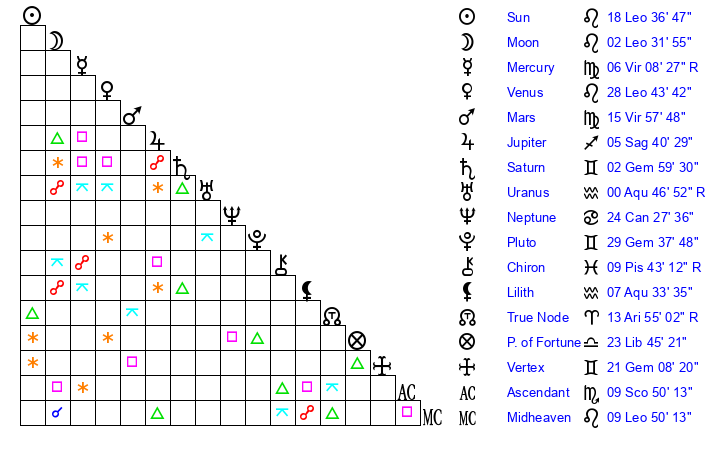 Moon | 2 Leo 29 | 19 Pisces 42 | 26 Virgo 12 |