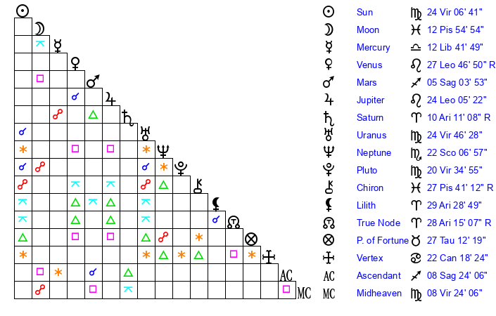Sun | 24 Virgo 7 | 25 Virgo 3 | 21 Scorpio 38 |