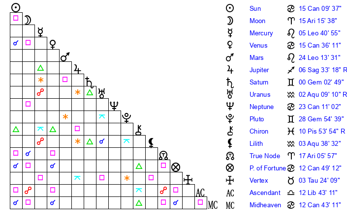 Moon | 15 Aries 5 | 9 Sagittarius 30 | 7 Gemini 6 |