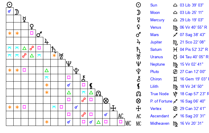 | Moon | 3 Libra 29 | 9 Sagittarius 37 | 16 Capricorn 12 |